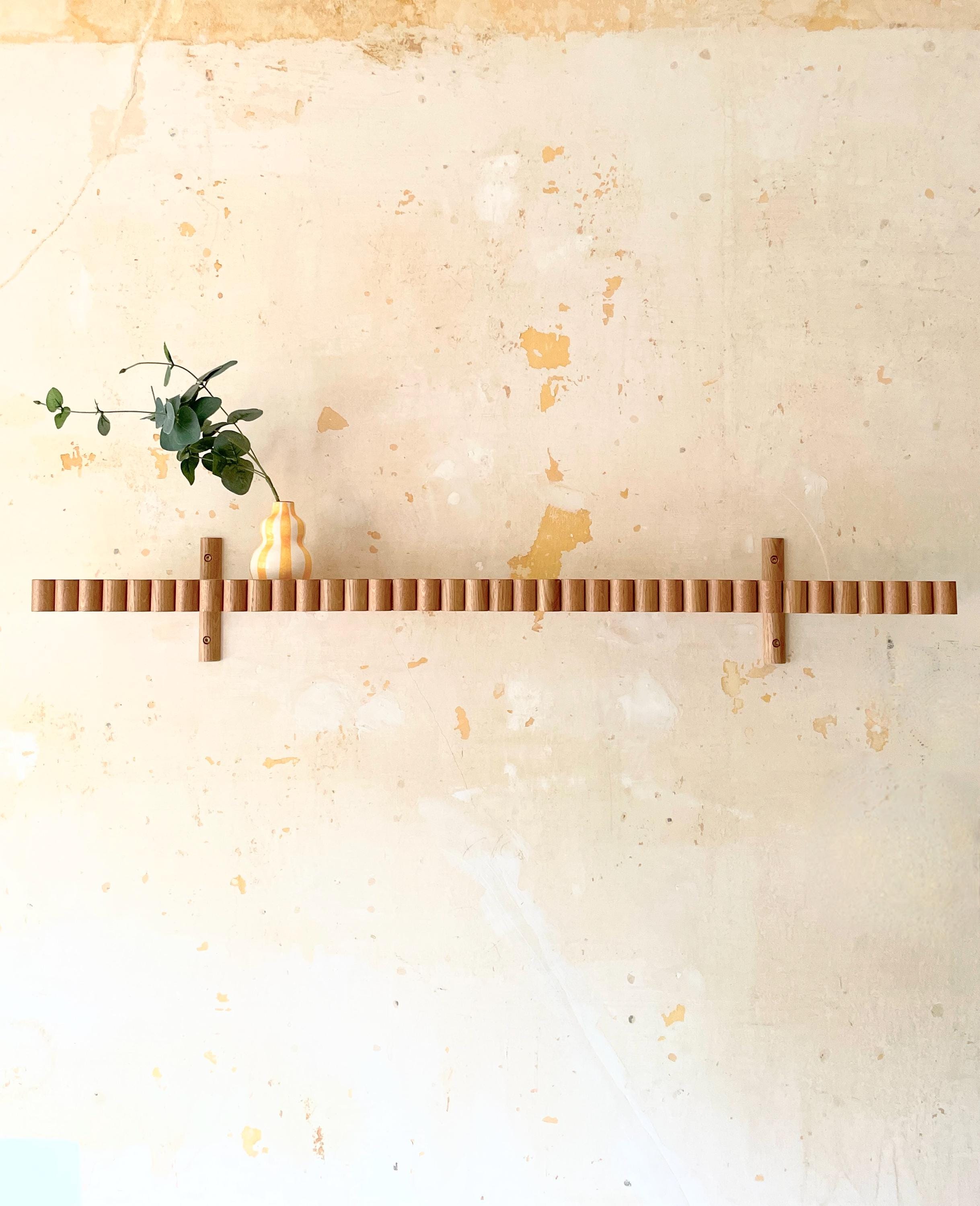 A sculptural scalloped floating wall shelf in solid American White Oak, designed with a timeless Art Deco twist.