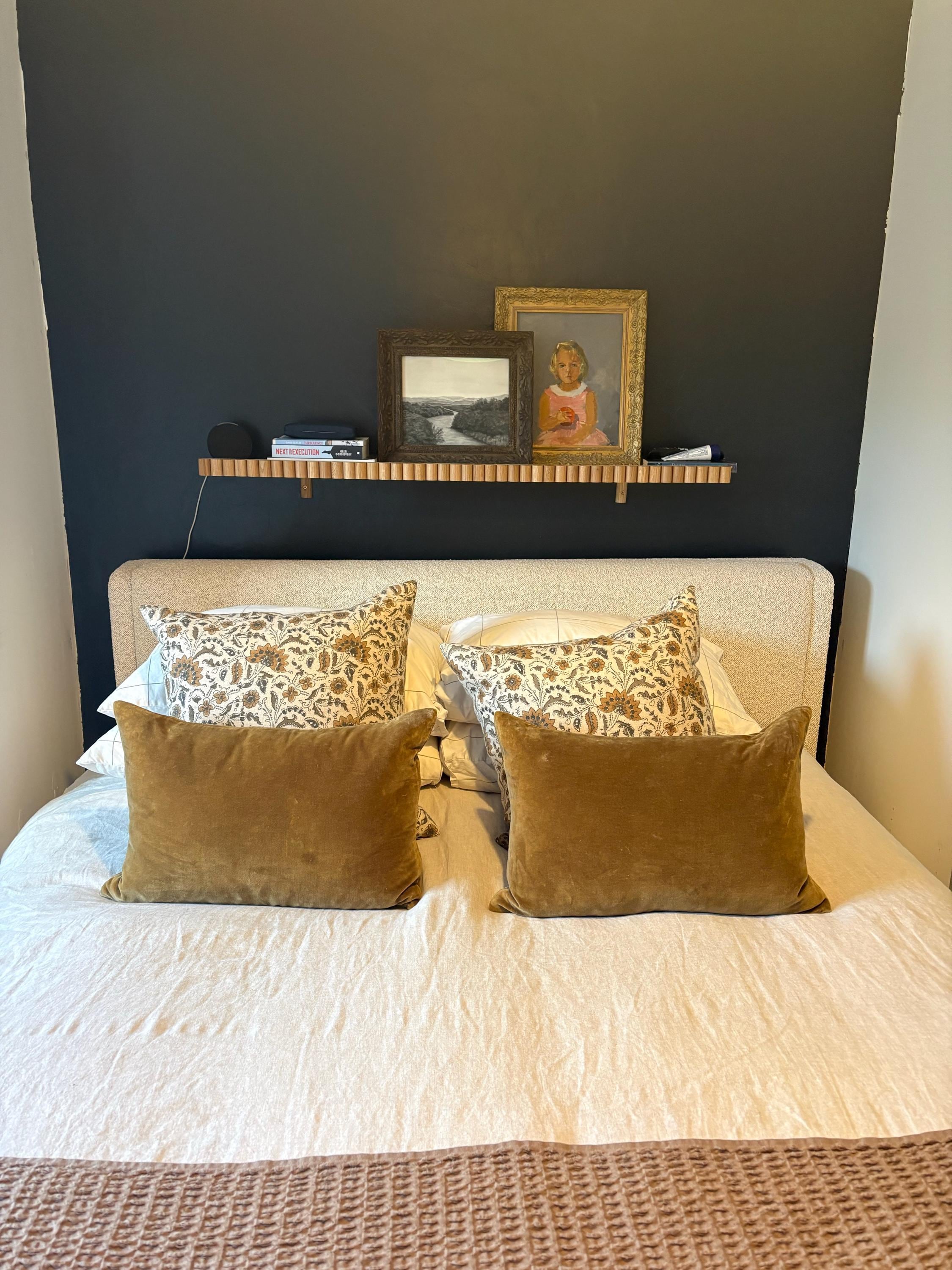 Half-moon oak brackets mirror the scalloped profile, creating a sculptural silhouette that’s both practical and decorative.