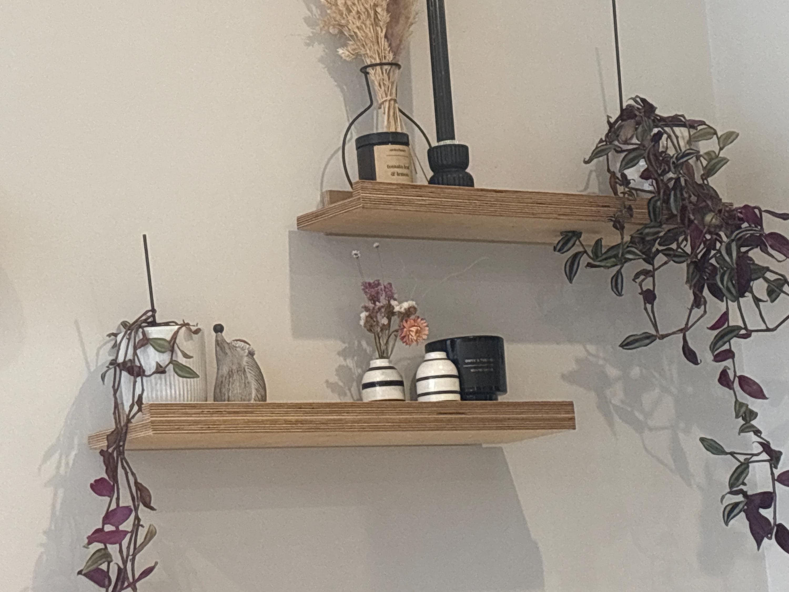 It's all about Birch plywood shelving & the elegant utility of the Birch Plywood does ALL the work in this clean & modern floating shelf design. The double thickness front lip showcases the sleek linear qualities of the plywood. Whilst the inset bracket adds the proportion and balance needed to elevate this from purely functional shelf to considered modern design statement. And its all finished with the highest quality OSMO Hardwax oil to accentuate the gorgeous natural qualities of the warm Birch plywood.