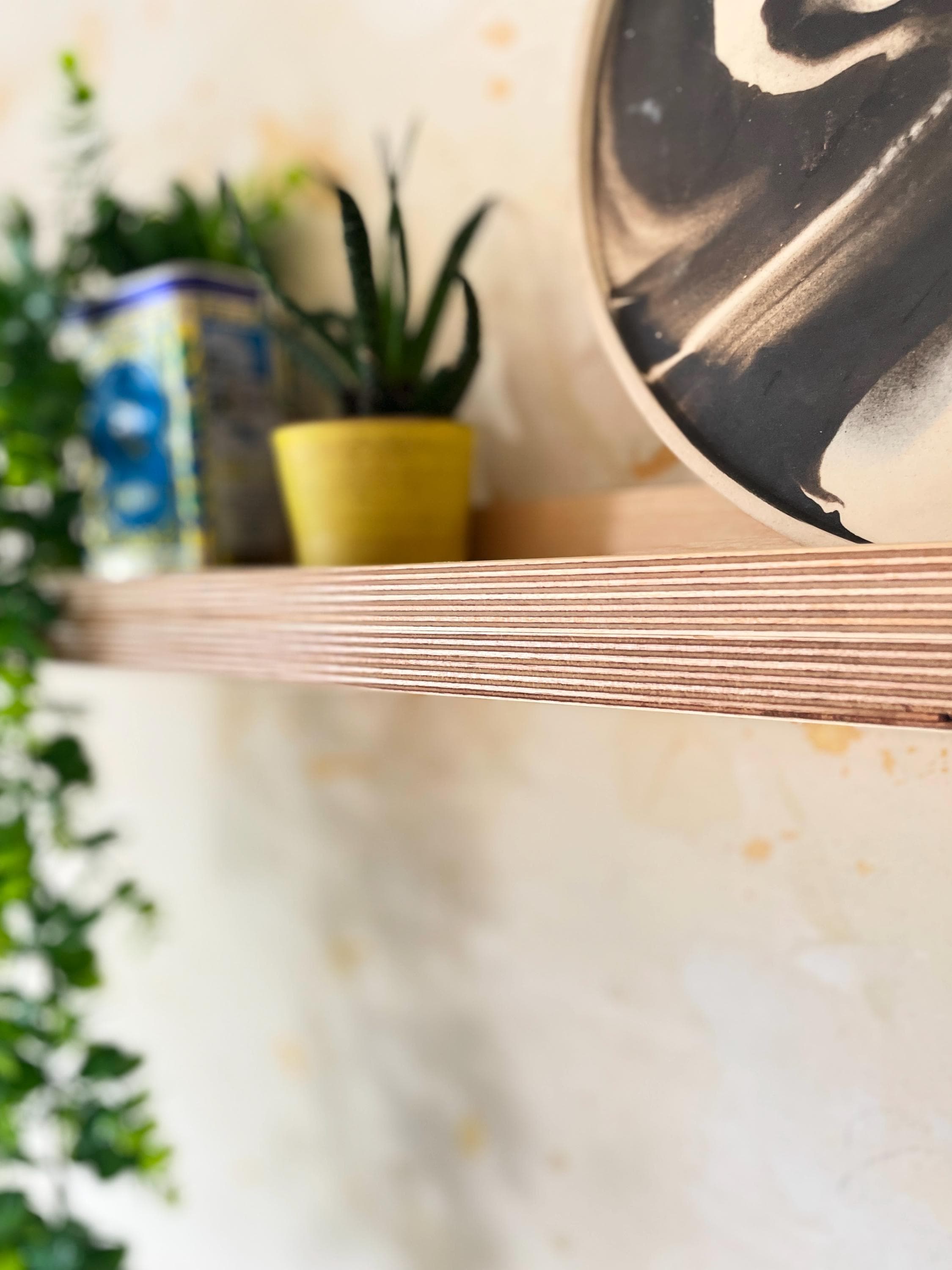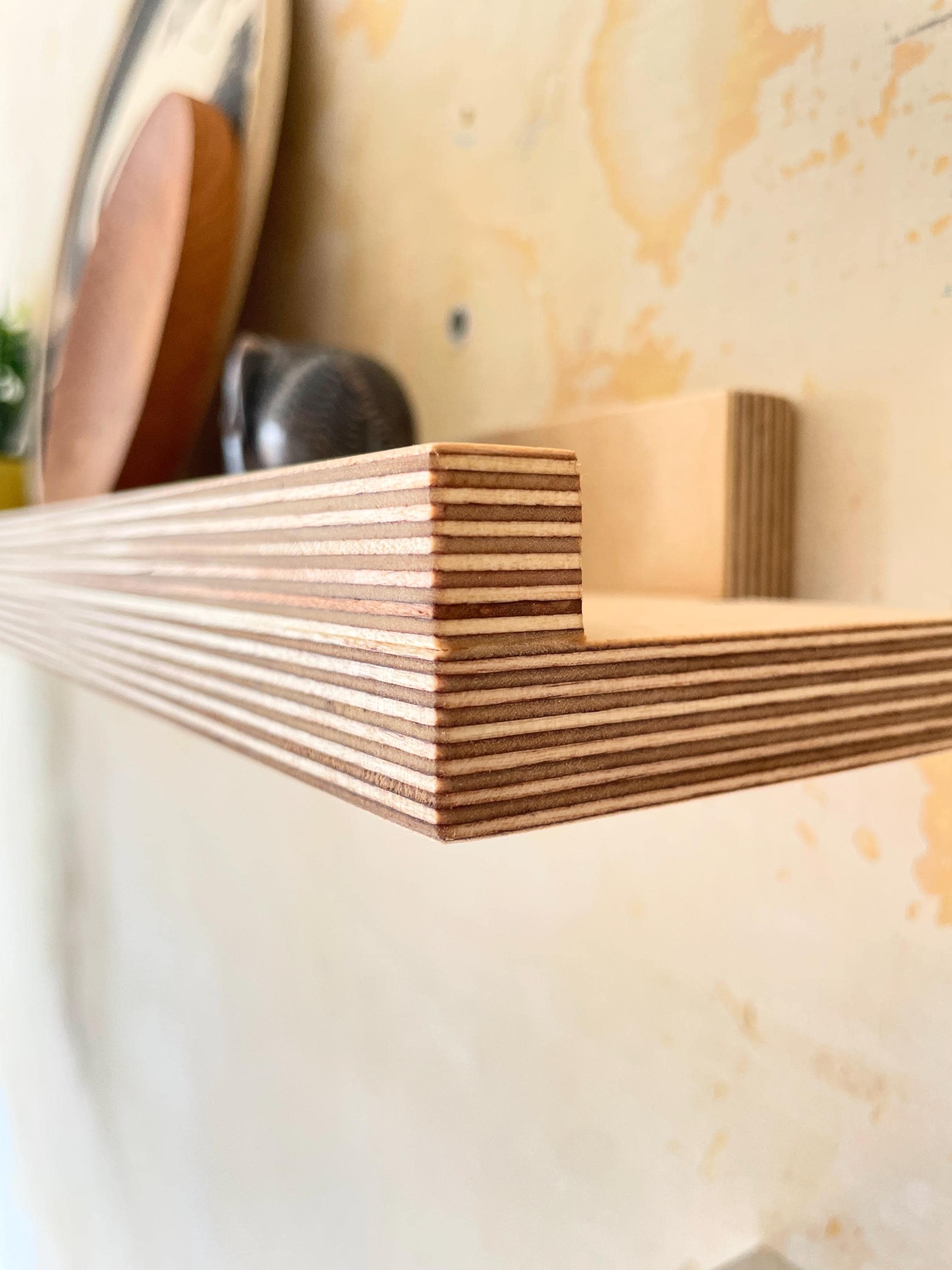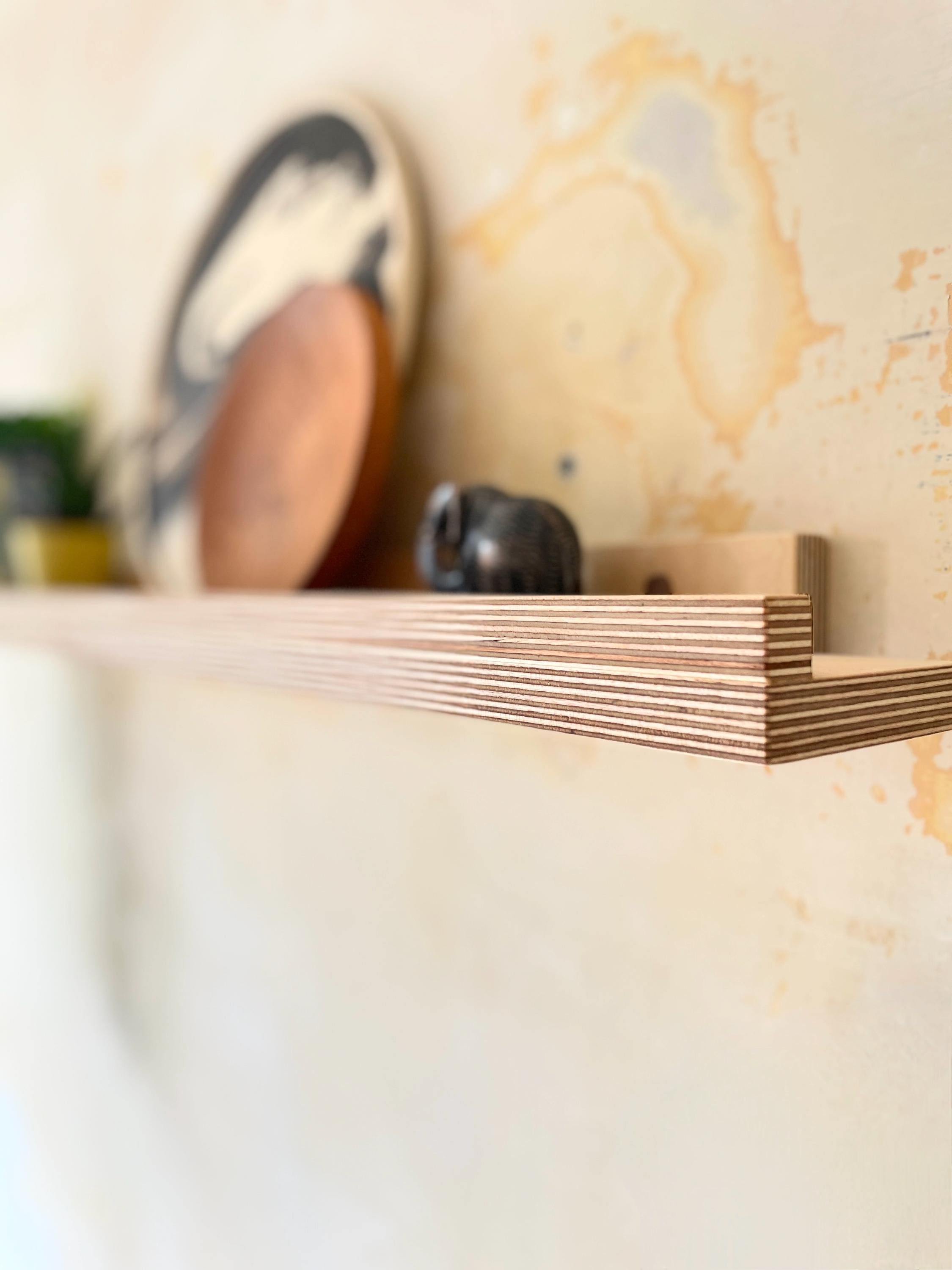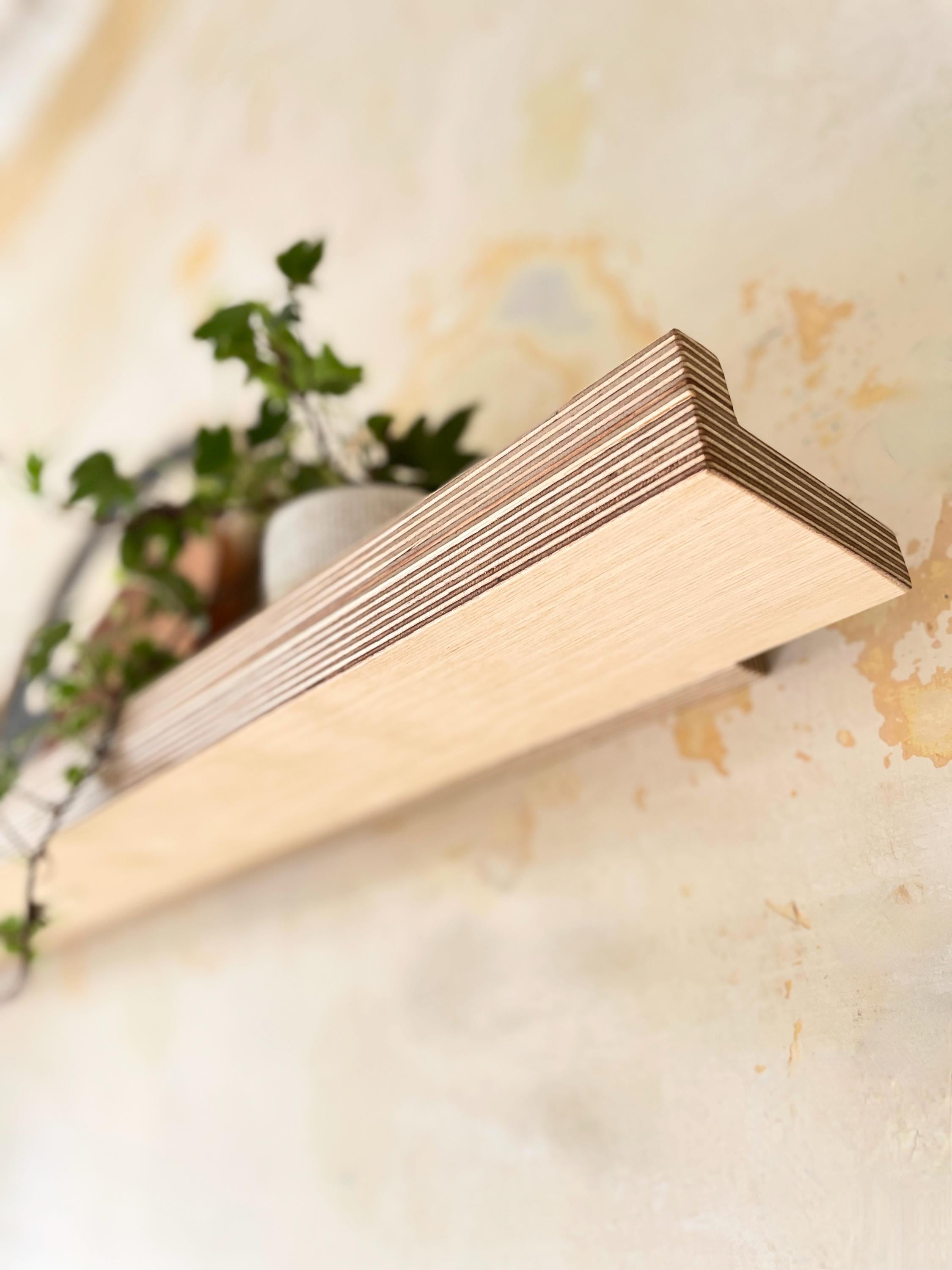 A clean, modern floating wall shelf in Baltic birch plywood, designed to celebrate the material’s natural beauty and structural elegance.