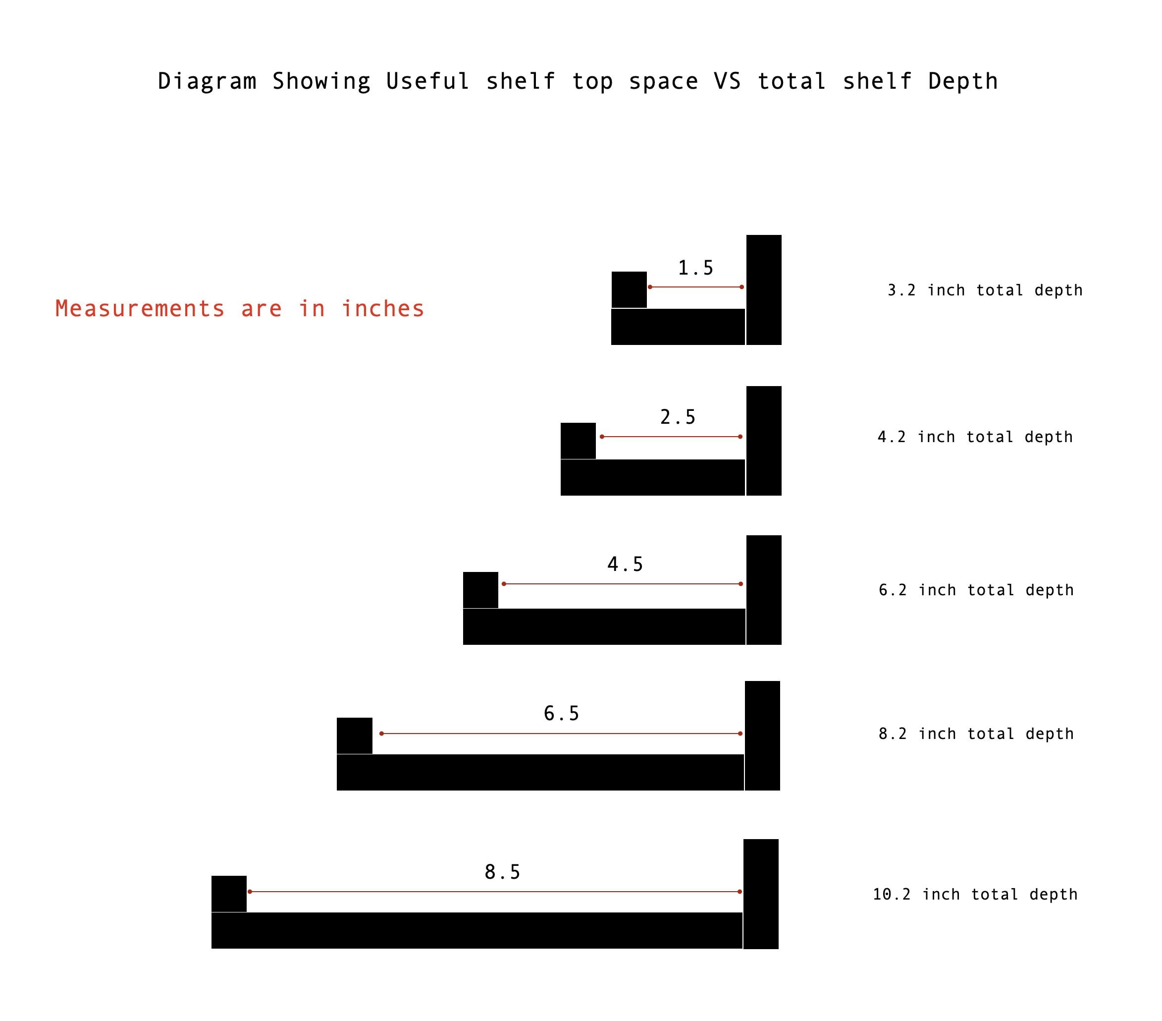 ▪ Usable shelf top space is approximately 1.5″ (40 mm) less than the total shelf depth due to the front lip design