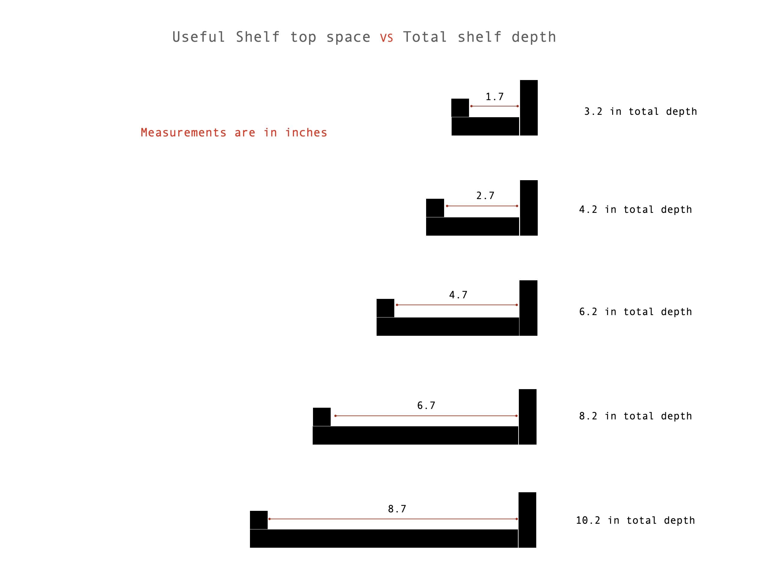 ▪ Usable shelf top space is approximately 1.5" (40 mm) less than the total shelf depth due to the front lip design.