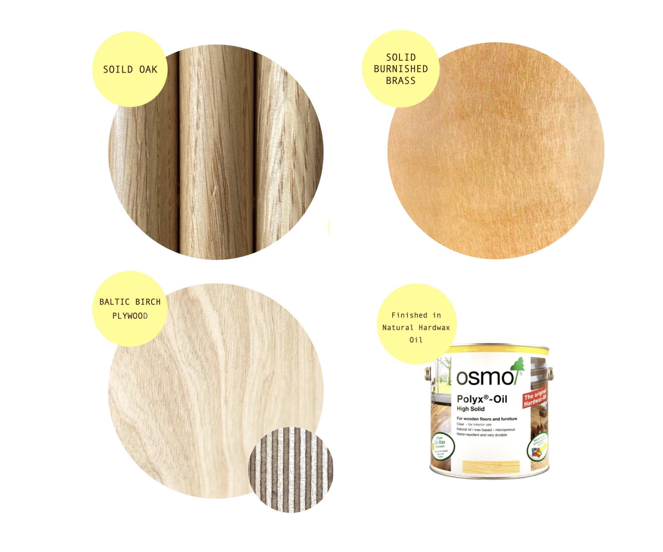 The front edge features tactile, hand-carved oak scallops that create a rhythmic, architectural profile. Each scallop reveals the natural warmth and character of the oak, making every shelf unique. Complementing this, the solid brass brackets add a luxurious metallic sheen and structural elegance, while the smooth Baltic birch plywood surface provides a subtle shimmer and clean, contemporary base.