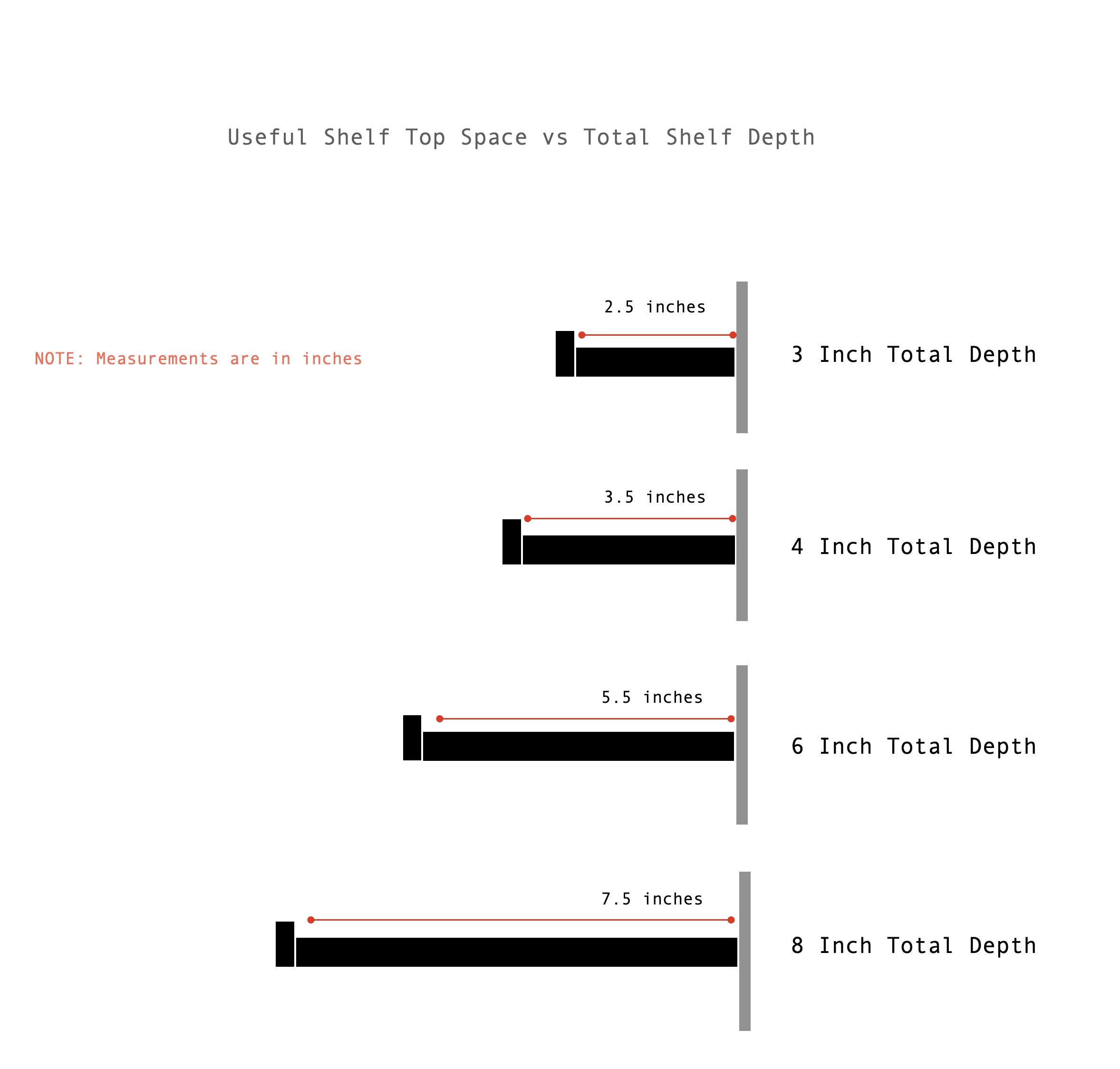 ▪ Usable shelf depth is approximately ½″ (12 mm) less than total depth due to the scalloped tray edge