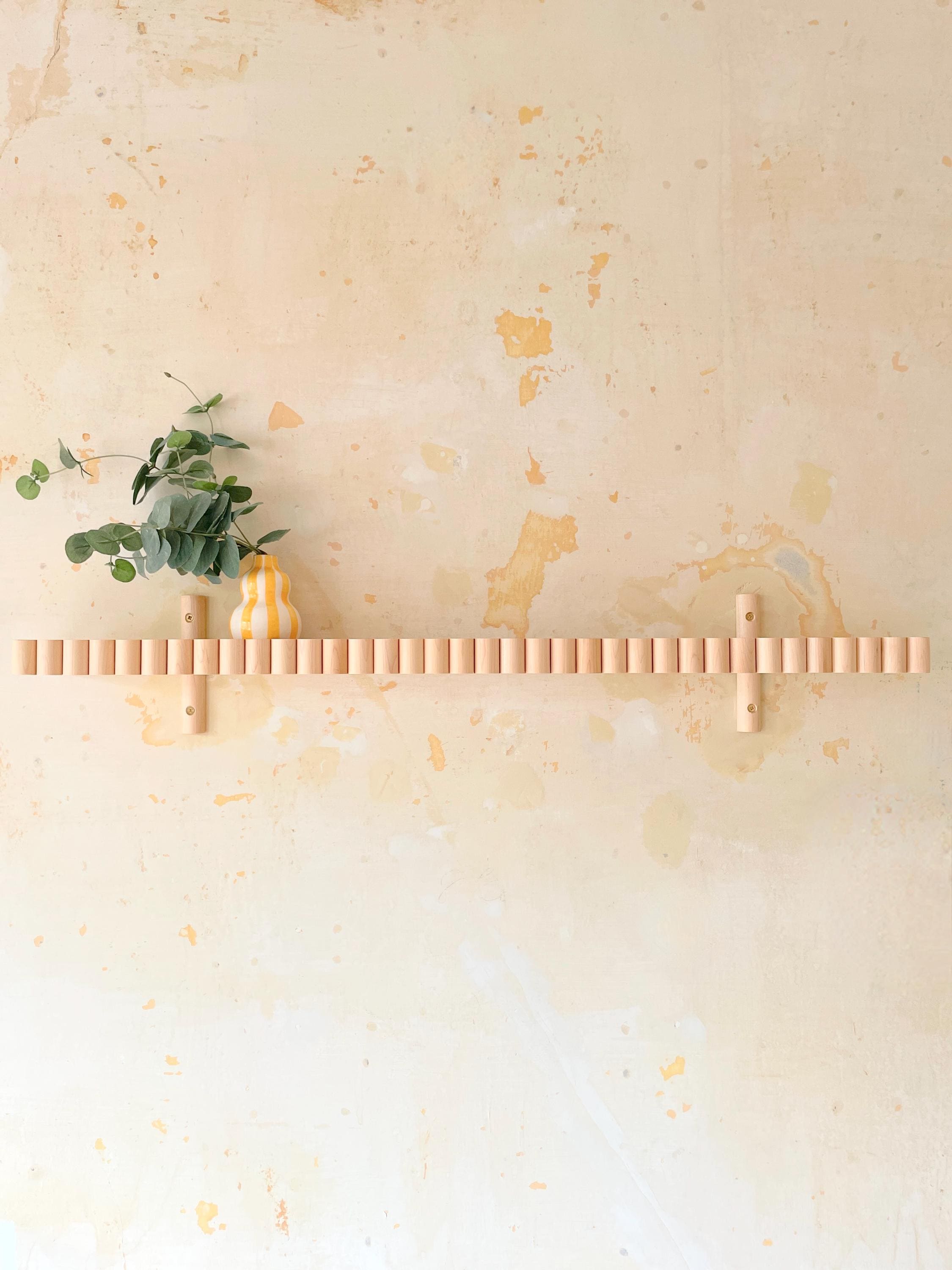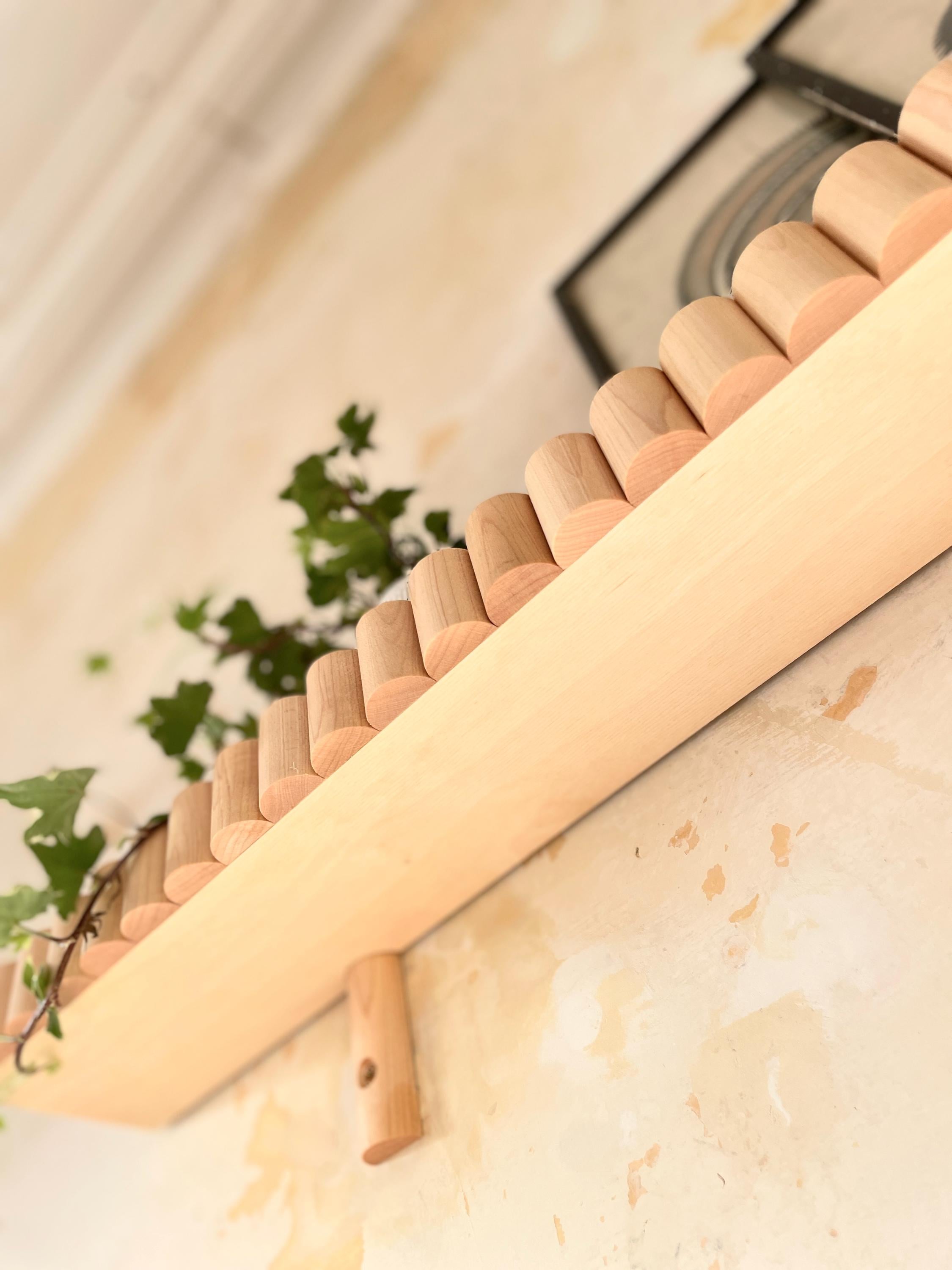 A light, sculptural scalloped floating shelf crafted from solid Maple with a timeless Art Deco influence.