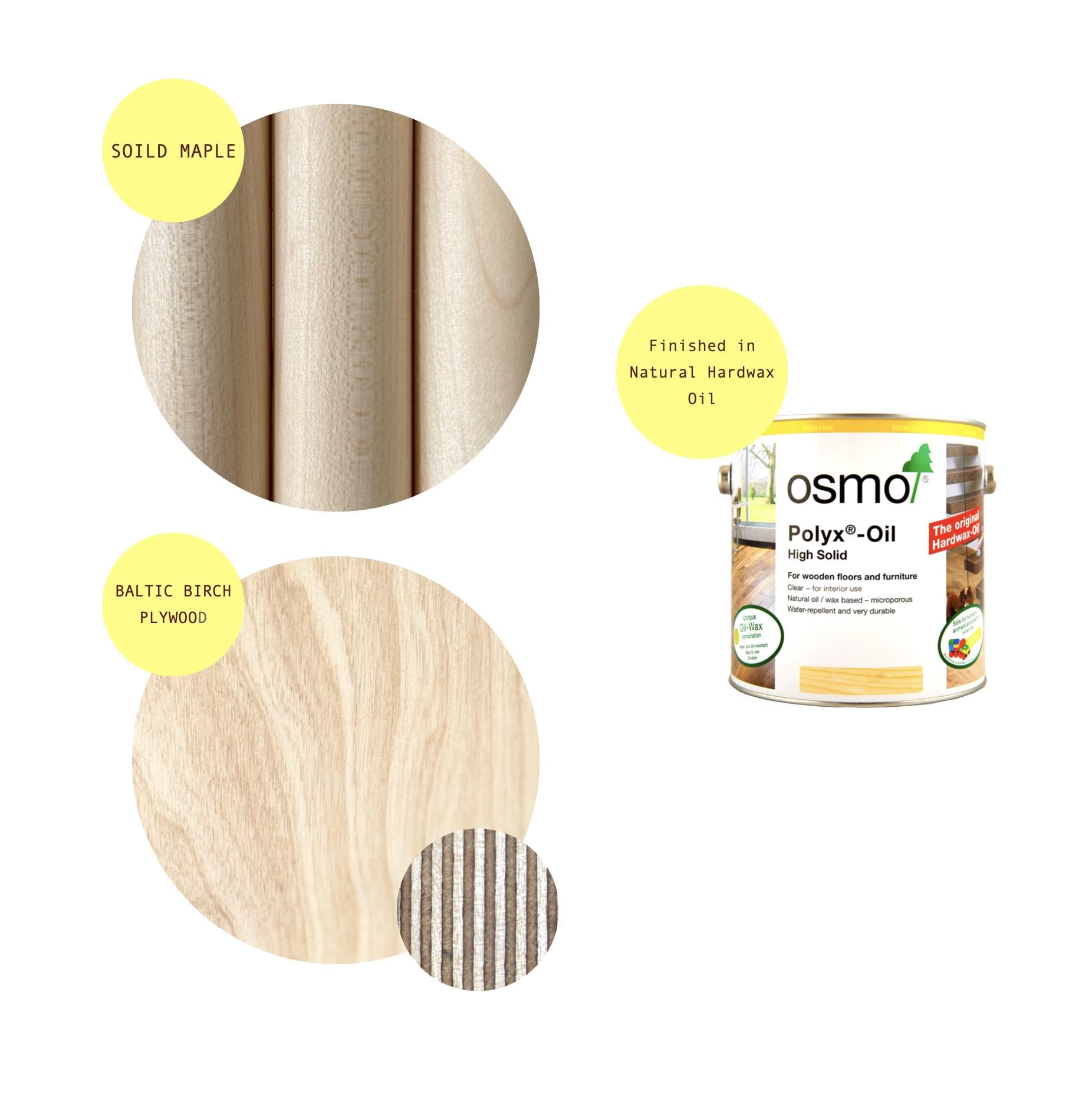 The gently rippled Maple front edge creates a soft, repeating scallop detail, while the smooth Baltic birch surface keeps the overall look clean and contemporary. The pale tone and subtle grain of Maple bring a calm, modern feel to Scandinavian, Japandi, and contemporary interiors.