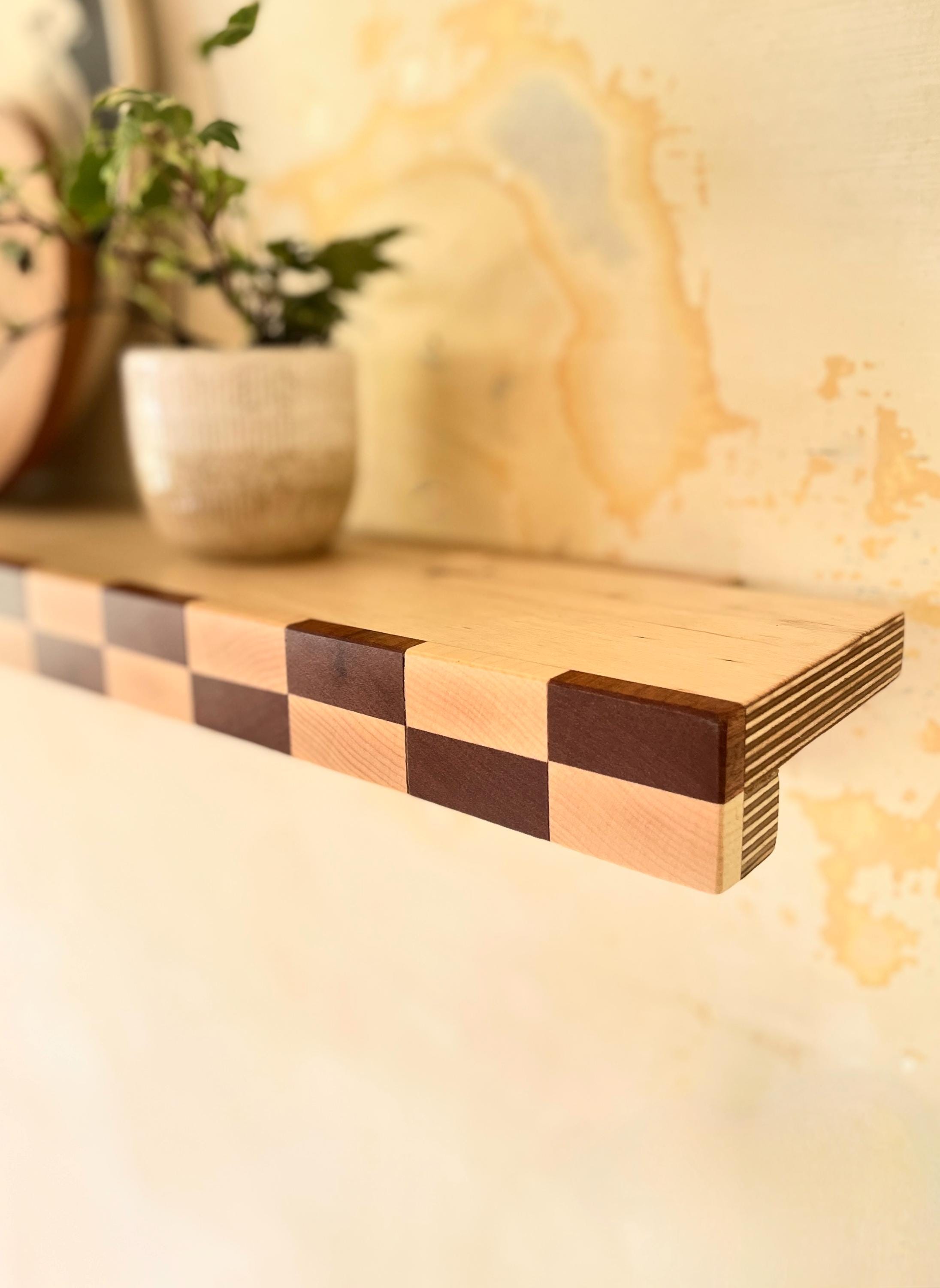 This bold checkerboard floating shelf transforms everyday storage into a sculptural mid-century design statement with maximal personality.