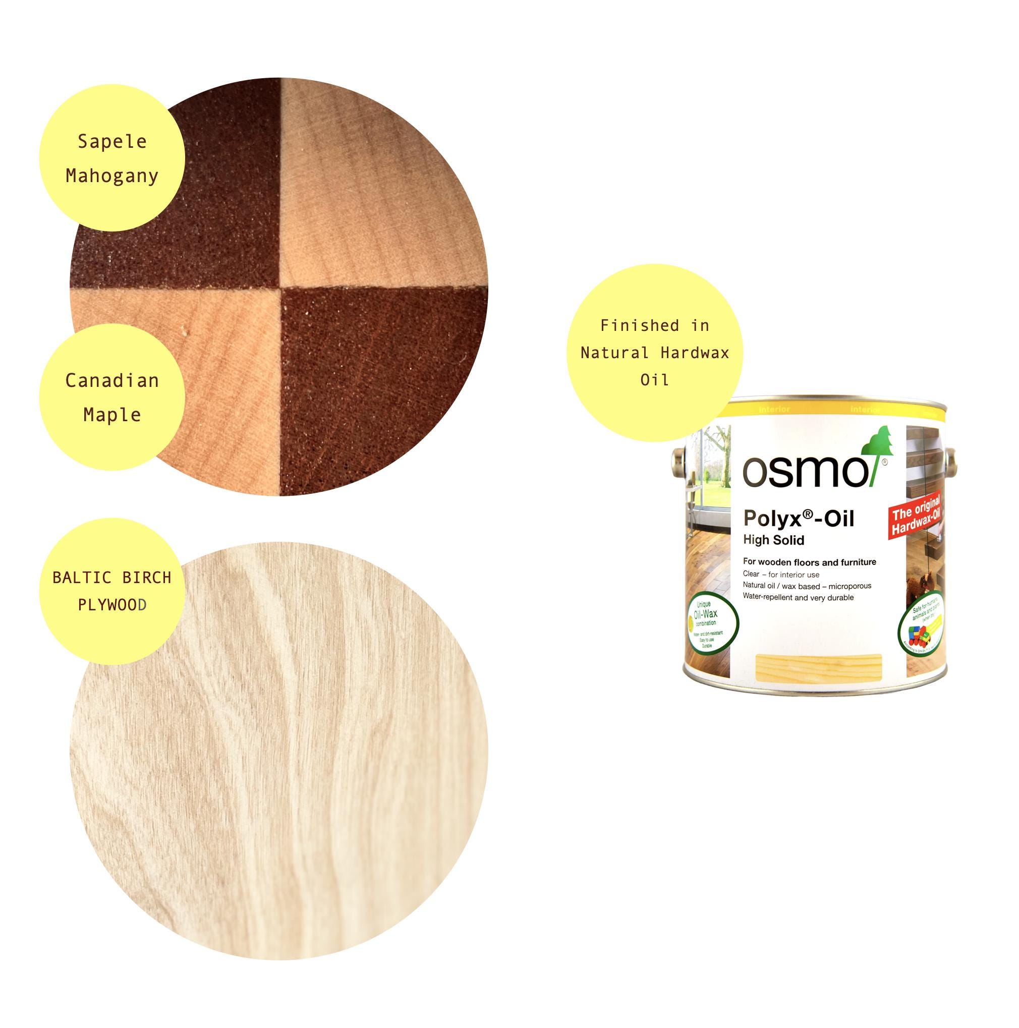 Handcrafted from end-grain Canadian White Maple and rich Sapele Mahogany, the front fascia forms a wildly satisfying checkerboard marquetry pattern. The creamy maple and warm red-toned mahogany work harmoniously together, their natural hues intensified by the distinctive cellular structure of the end grain.